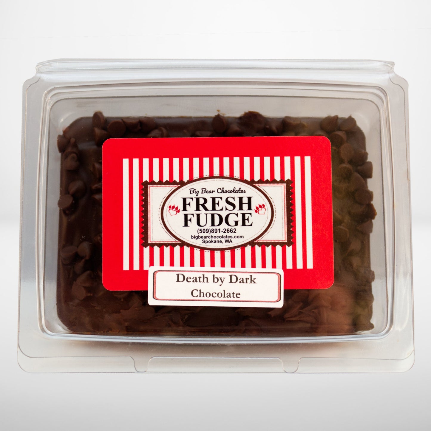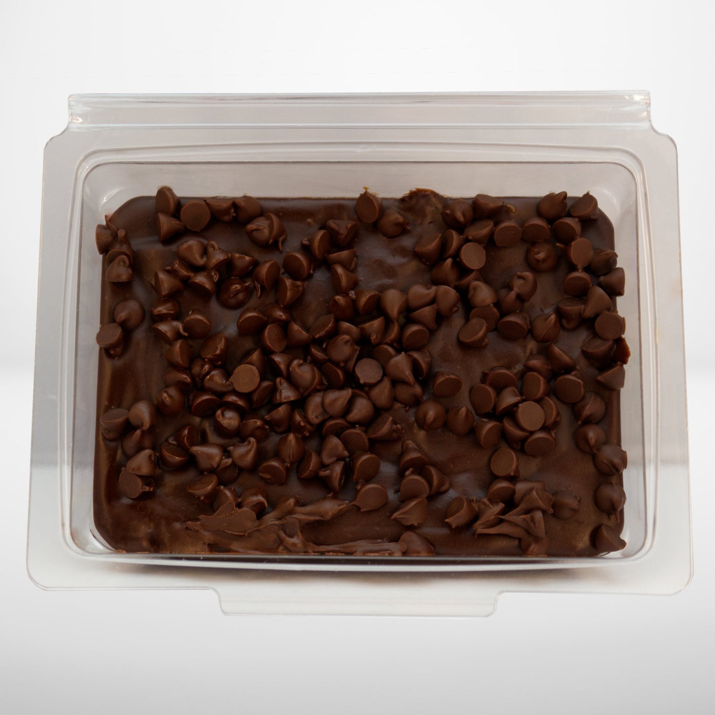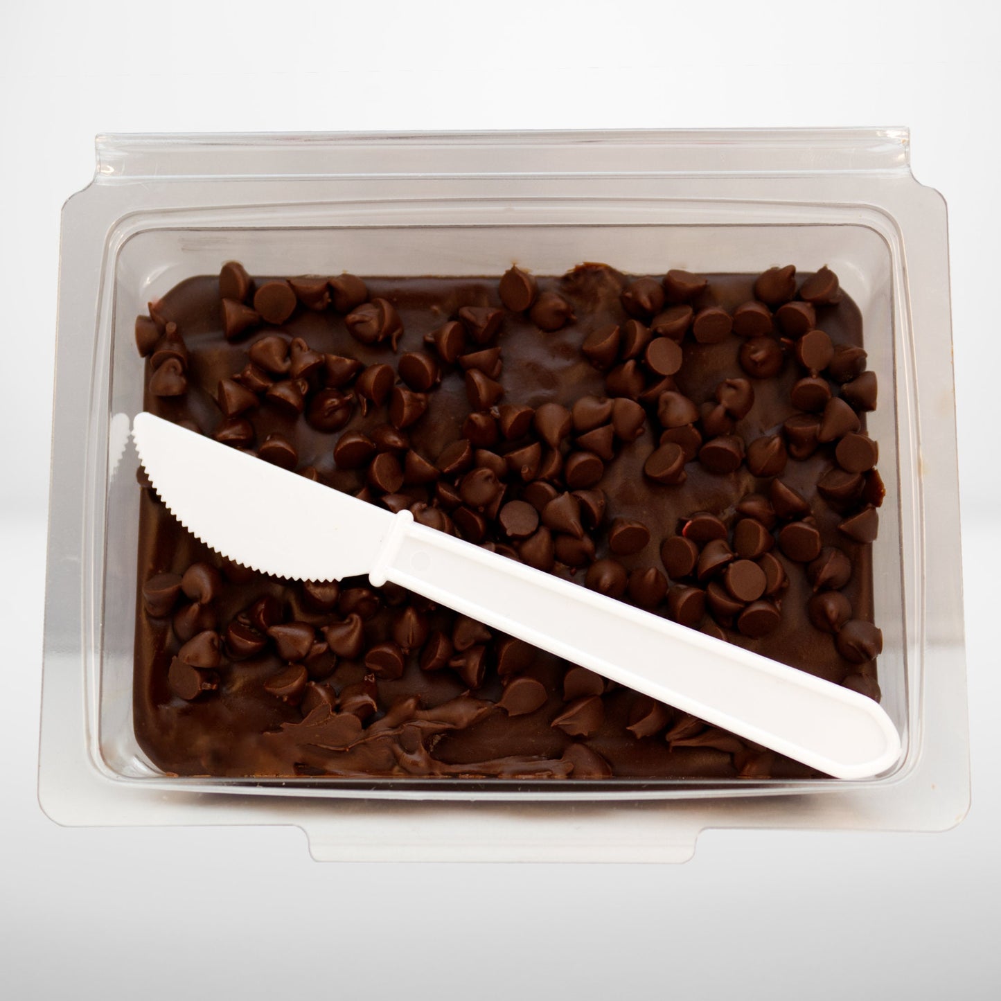 Delicious 3/4 pound tub of Fresh Fudge! Rich Dark Chocolate fudge with a topping of dark chocolate chips. Each container comes with a convenient plastic knife and is resealable.