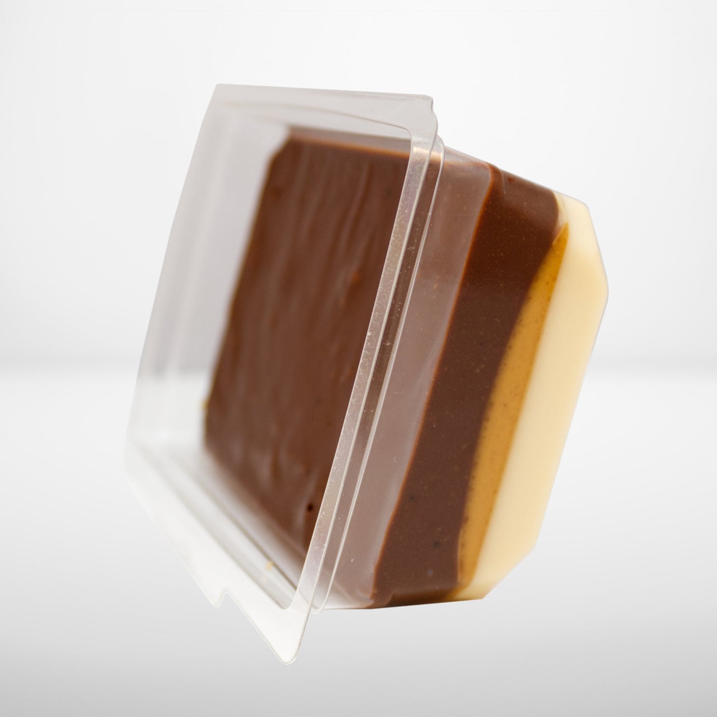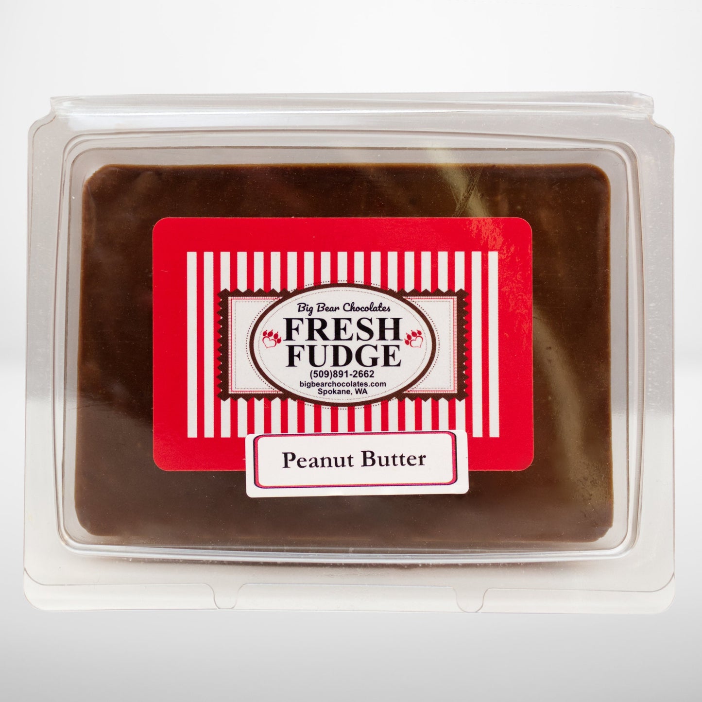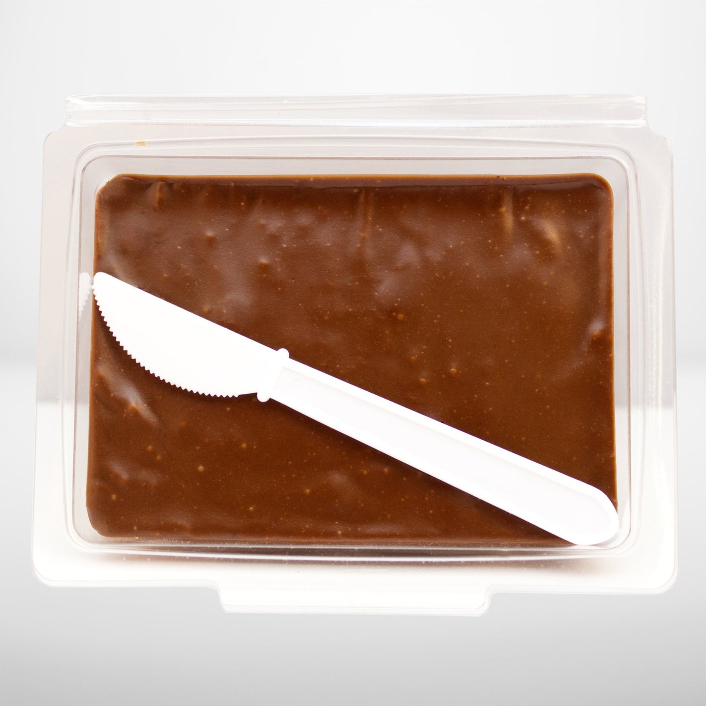 A 3/4 lb. Container of our Peanut Butter Chocolate Fudge. We start the fudge with a layer of Vanilla at the bottom, then put a second layer of chunky Peanut Butter and finish the top off with our Milk Chocolate Fudge. Each container comes packaged with a plastic knife and is resealable.