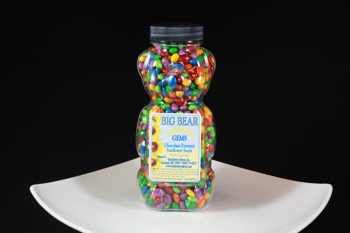 These are sunflower seeds, covered in Milk Chocolate, then candied in different colors. Packaged in a bear shape.