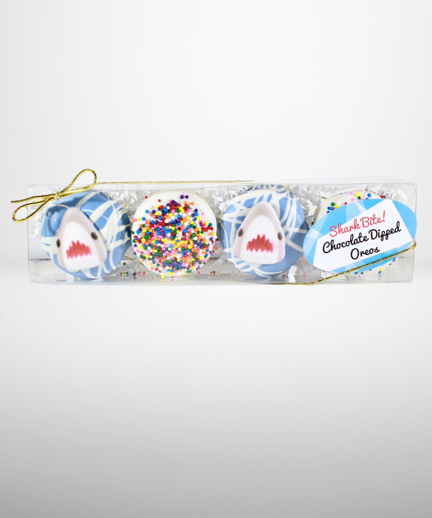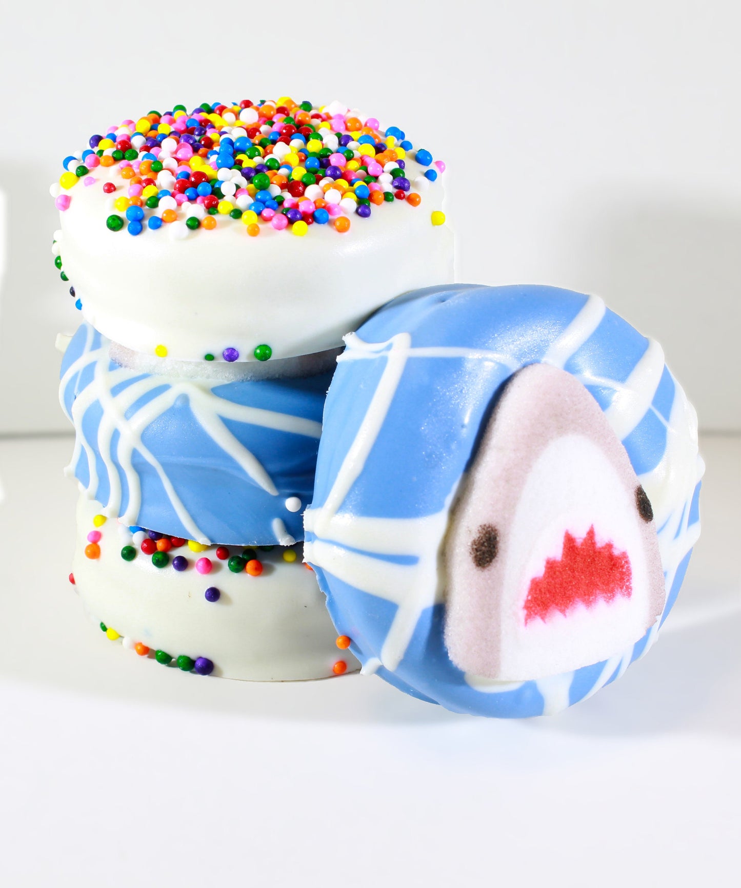 Four gourmet chocolate dipped Oreo cookies. Shark Decal Oreos are fully dipped in colored white chooclate.