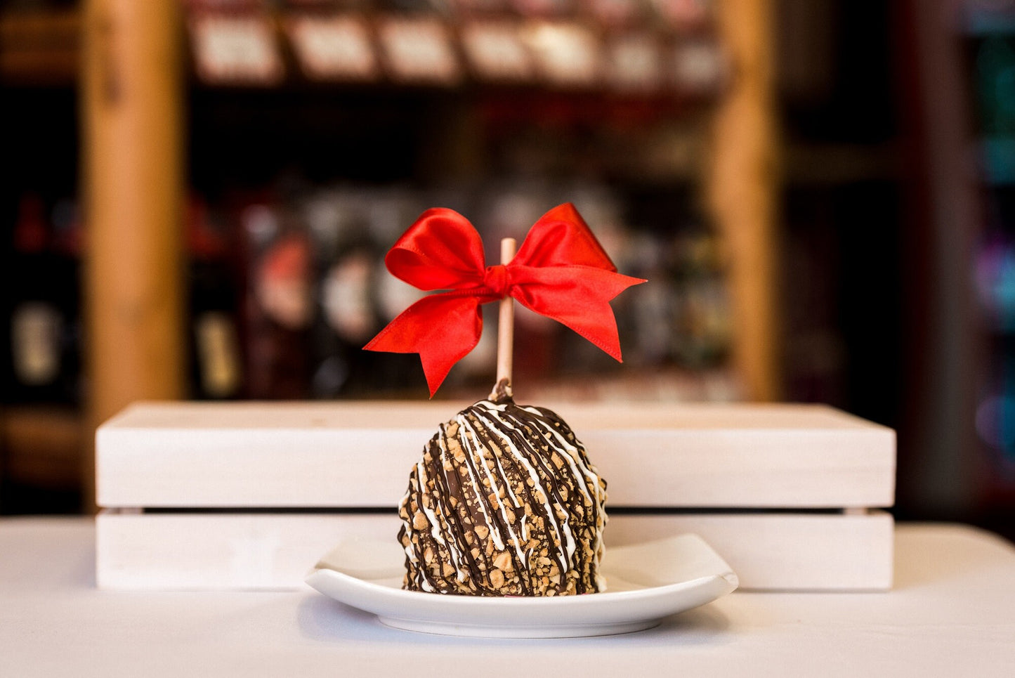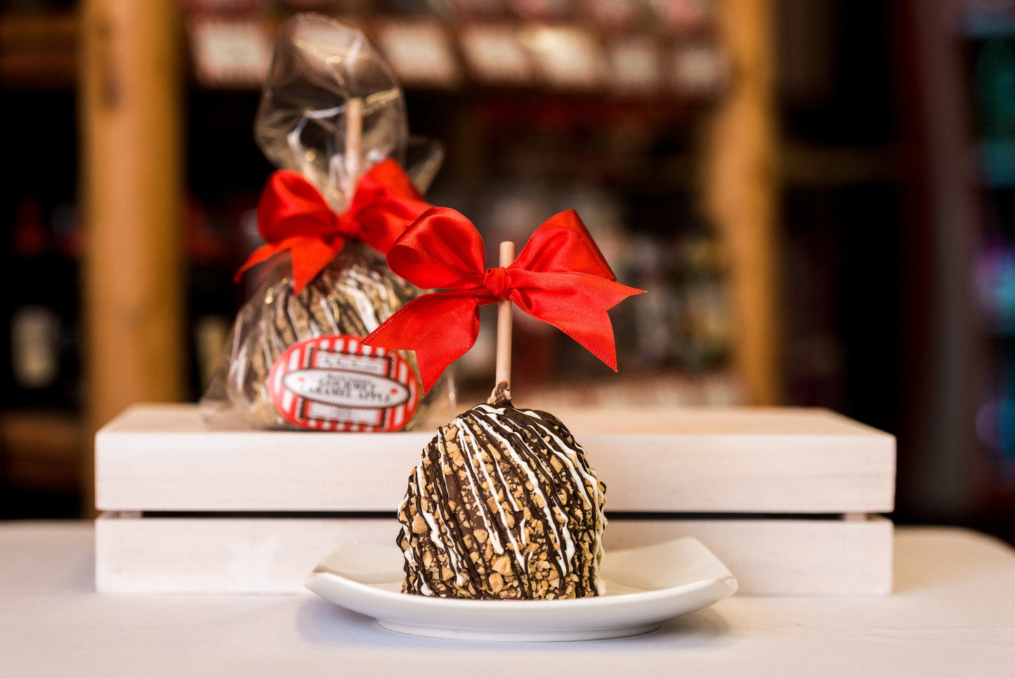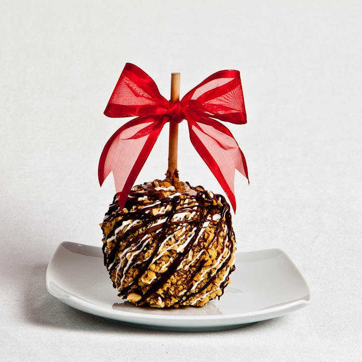 Fresh and juicy Granny Smith apple, dipped in our homemade caramel, and then coated with milk chocolate and crushed peanuts and then drizzled with dark and white chocolate. So yummy!